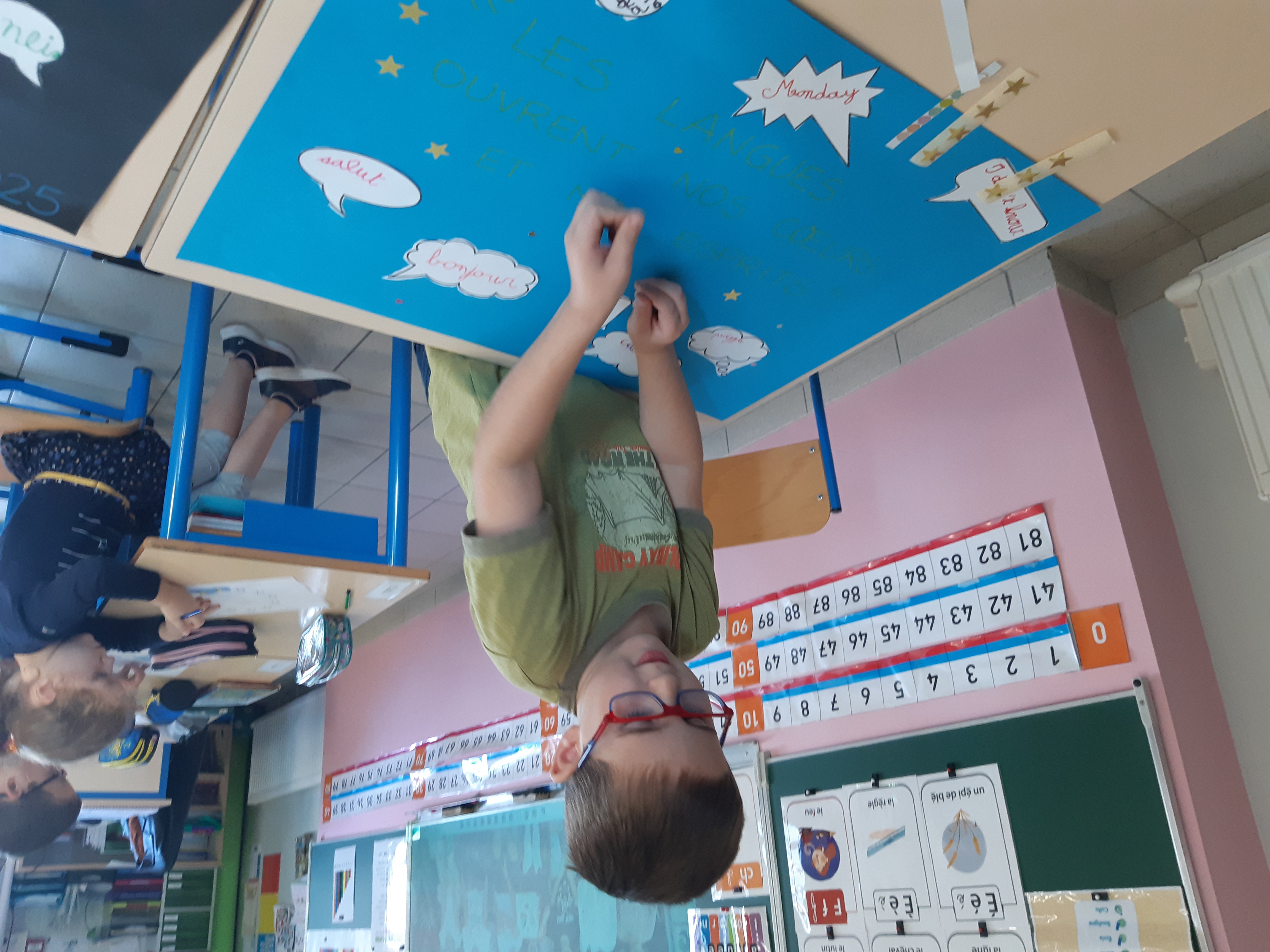 Pour cela, ils ont d’abord collecté des mots qu’ils connaissaient en langues étrangères : des mots anglais, allemands, espagnols, italiens et français ont été proposés. Ils les ont copiés avec beaucoup d’application sur des bulles qu’ils ont ensuite disposées sur leurs affiches. Pour finir, ils ont ajouté des cœurs ainsi que 12 étoiles en rappel des étoiles présentes sur le drapeau européen.