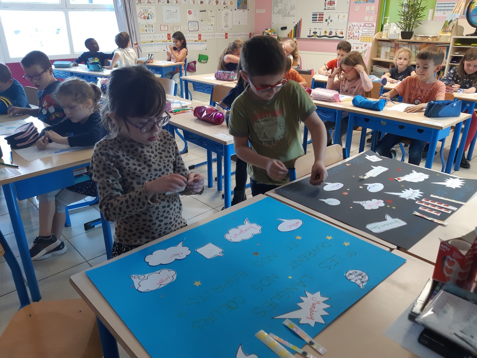 Pour cela, ils ont d’abord collecté des mots qu’ils connaissaient en langues étrangères : des mots anglais, allemands, espagnols, italiens et français ont été proposés. Ils les ont copiés avec beaucoup d’application sur des bulles qu’ils ont ensuite disposées sur leurs affiches. Pour finir, ils ont ajouté des cœurs ainsi que 12 étoiles en rappel des étoiles présentes sur le drapeau européen.