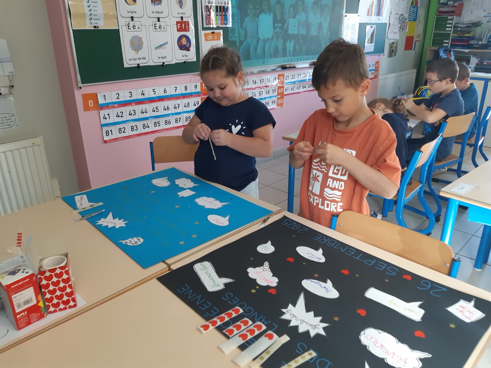 Pour cela, ils ont d’abord collecté des mots qu’ils connaissaient en langues étrangères : des mots anglais, allemands, espagnols, italiens et français ont été proposés. Ils les ont copiés avec beaucoup d’application sur des bulles qu’ils ont ensuite disposées sur leurs affiches. Pour finir, ils ont ajouté des cœurs ainsi que 12 étoiles en rappel des étoiles présentes sur le drapeau européen.