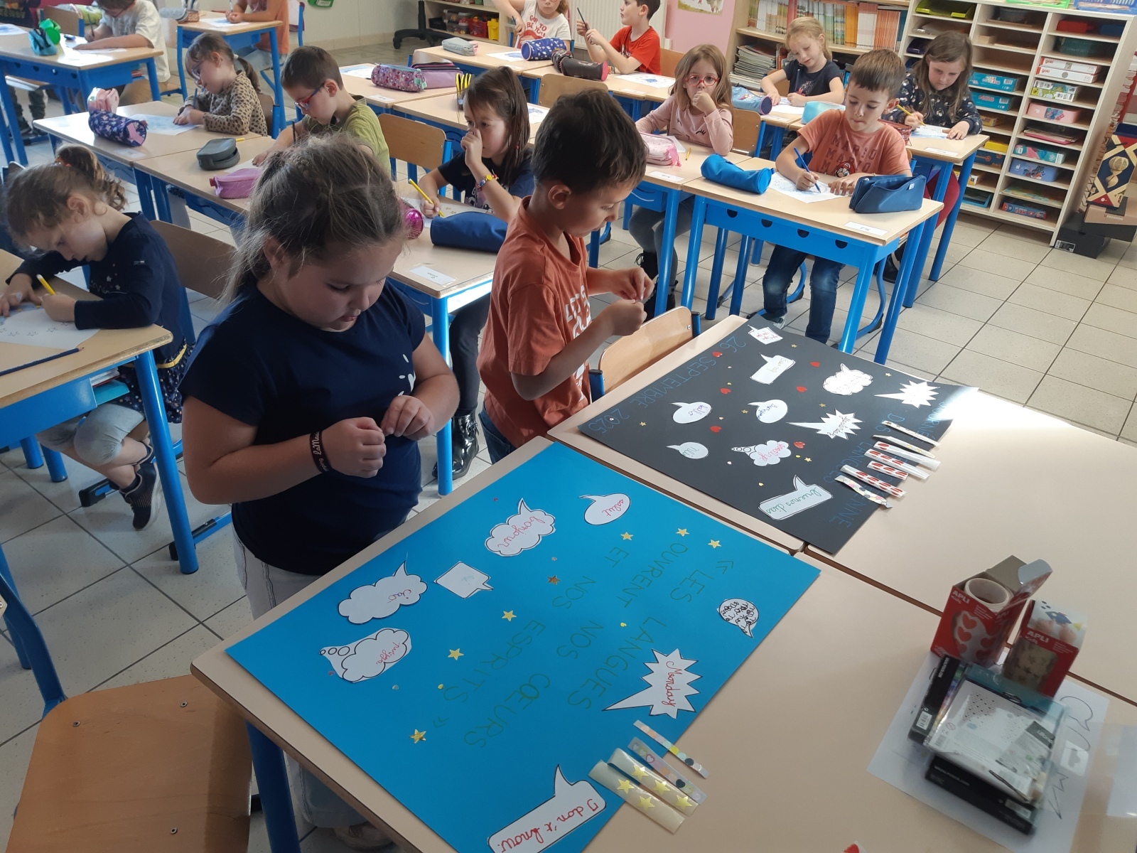 Pour cela, ils ont d’abord collecté des mots qu’ils connaissaient en langues étrangères : des mots anglais, allemands, espagnols, italiens et français ont été proposés. Ils les ont copiés avec beaucoup d’application sur des bulles qu’ils ont ensuite disposées sur leurs affiches. Pour finir, ils ont ajouté des cœurs ainsi que 12 étoiles en rappel des étoiles présentes sur le drapeau européen.