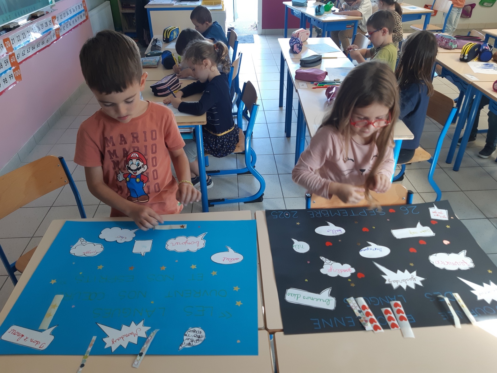 Pour cela, ils ont d’abord collecté des mots qu’ils connaissaient en langues étrangères : des mots anglais, allemands, espagnols, italiens et français ont été proposés. Ils les ont copiés avec beaucoup d’application sur des bulles qu’ils ont ensuite disposées sur leurs affiches. Pour finir, ils ont ajouté des cœurs ainsi que 12 étoiles en rappel des étoiles présentes sur le drapeau européen.