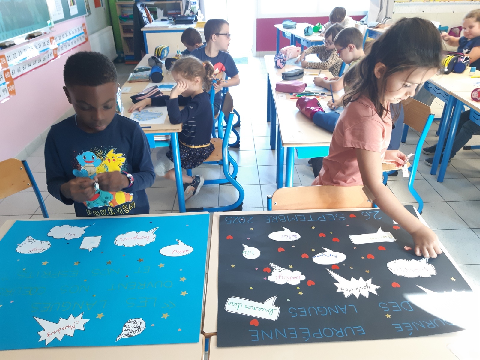 Pour cela, ils ont d’abord collecté des mots qu’ils connaissaient en langues étrangères : des mots anglais, allemands, espagnols, italiens et français ont été proposés. Ils les ont copiés avec beaucoup d’application sur des bulles qu’ils ont ensuite disposées sur leurs affiches. Pour finir, ils ont ajouté des cœurs ainsi que 12 étoiles en rappel des étoiles présentes sur le drapeau européen.